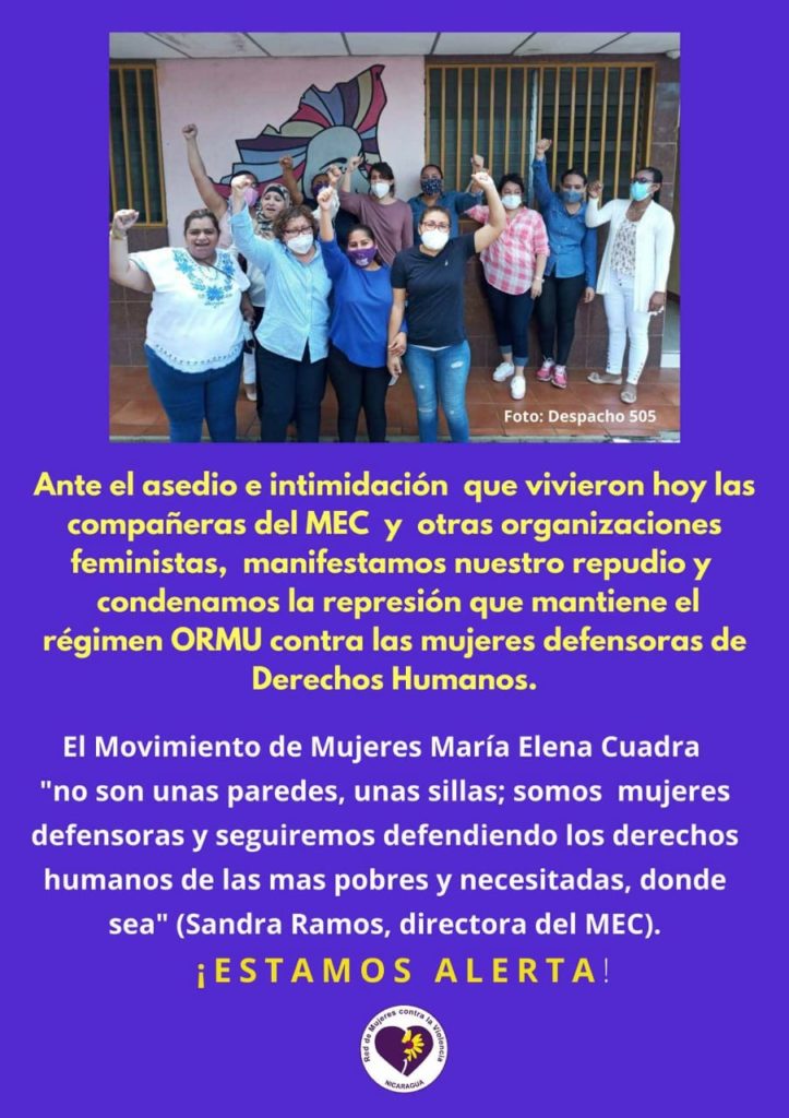 Am Freitag 25. September 2020 wurde die Organisation Maria Elena Cuadra in Managua von der sandinistischen Polizei angegriffen. Sie stellten sich vor dem Gebäude auf und ließen die Mitarbeiter*innen nicht eintreten. In despacho505 kann näheres auf spanisch nachgelesen werden.
