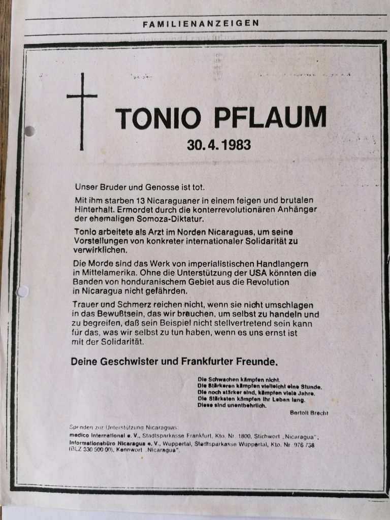 Heute vor 38 Jahren, am 30.April 1983 wurde der deutsche Arzt Tonio Pflaum zusammen mit 13 Nicaraguaner:innen in Zompopera im Norden Nicaraguas von der Contra ermordet. Ich war damals mit einer Delegation des Interkirchlichen Friedensrates in Nicaragua und konnte nach meiner Rückkehr im „Heute Journal“ über diesen Mord berichten. Auf einmal gab es Interesse in den deutschen Medien an diesem Abnutzungskrieg.