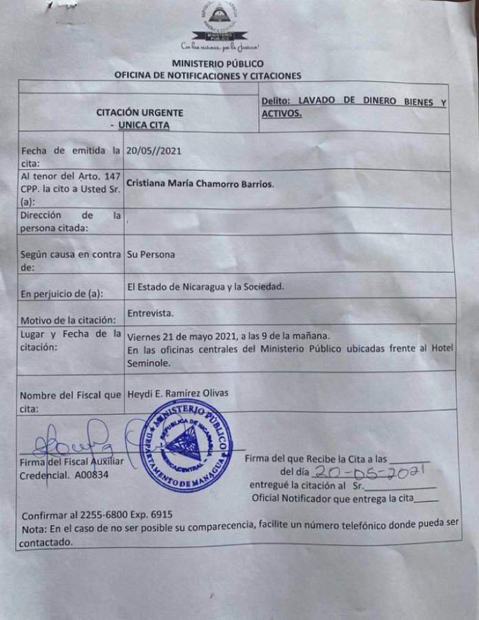 Chamorro machte deutlich, dass sie zur Staatsanwaltschaft gehen werde, um „diese Farce zu entlarven“. Am 20. Mai wurde die Tochter der ehemaligen nicaraguanischen Präsidentin Violeta Barrios und Pedro Joaquín Chamorro, ein Märtyrer für die öffentlichen Freiheiten, von Beamten des Innenministeriums (Migob) einem dreistündigen Verhör unterzogen.