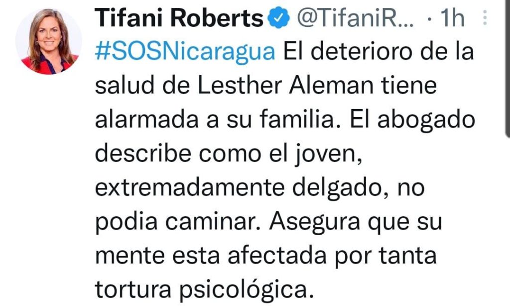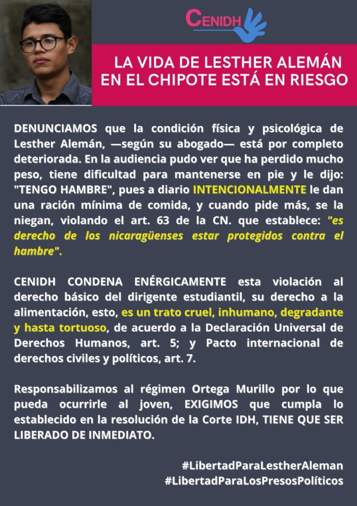 Wir klagen an, dass die physische und psychologische Verfassung – wie sein Anwalt sagt – im schlechtesten Zustand ist. Bei seinem Besuch konnte er sehen, dass er sehr viel Gewicht verloren hat und sich kaum auf den Beinen halten konnte. Er hat gesagt: „Ich habe Hunger“. Es wird ihm vorsätzlich nur ein Minimum an Essen gegeben und wenn er um mehr bittet, wird ihm das verweigert. …. CENIDH (Centro nicaraguense de derechos humanos) verurteilt mit aller Deutlichkeit die Verletzung des Grundmenschenrechtes für den studentischen Führer, sein Recht auf Nahrung. Diese Behandlung sei grausam, inhuman, herabwürdigend und bis hin zu einer Folter. (siehe Artikel 5 der Allgemeinen Erklärung der Menschenrechte und Artikel 7 der internationalen Vereinbarung über die zivilen und politischen Rechte.