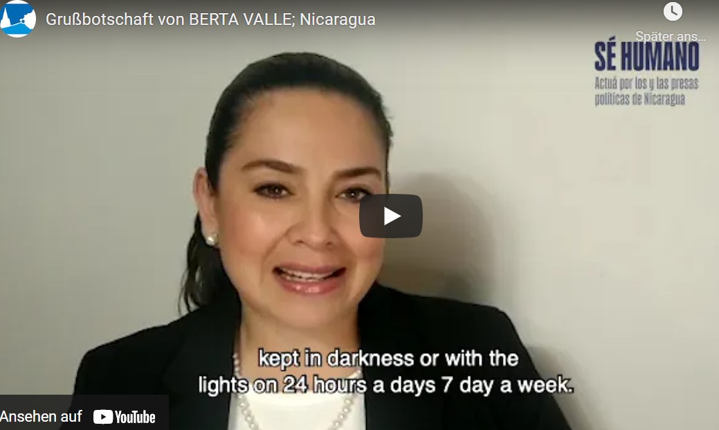 Der Städtepartnerschaftsverein Köln-Corinto konnte die Museumsausstellung des „Museo de la memoria contra la impunidad“ nach Köln holen. Mitglieder des „Vereins der Mütter des April“ (AMA y no olvida) eröffneten die Ausstellung zusammen mit 60 Teilnehmern am 24. April 2022. Berta Valle, Ehefrau des immer noch inhaftierten Felix Maradiaga, Kandidat für die nicaraguanische Präsidentschaftswahl im November 2021 in Nicaragua sandte zur Eröffnung diese Grußbotschaft. Das Grußwort wird hier mit freundlicher Genehmigung des Städtepartnerschaftsvereines Köln-Corinto e.V. gezeigt. Berta Valle hat dieses eingesprochen anläßlich der Ausstellungseröffnung AMA – Associación de madres de abril – zu den politischen Gefangenen und den Ermordeten des Jahres 2018 am 24. April 2022 in Köln.