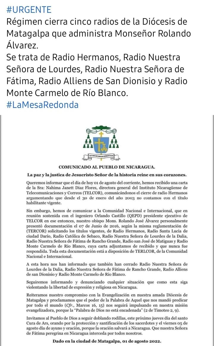Wir möchten informieren, dass wir heute am 1. August 2022 einen Brief von Frau Nahima Janett Diaz Flores bekommen haben, Generaldirektorin des Nationalen Instituts Telekommunikation und Post (TELCOR), mit der Information, dass Radio Hermanos geschlossen wird, da man seit 30 Januar 2003 nicht mit der ausreichenden Lizenz operiere.
