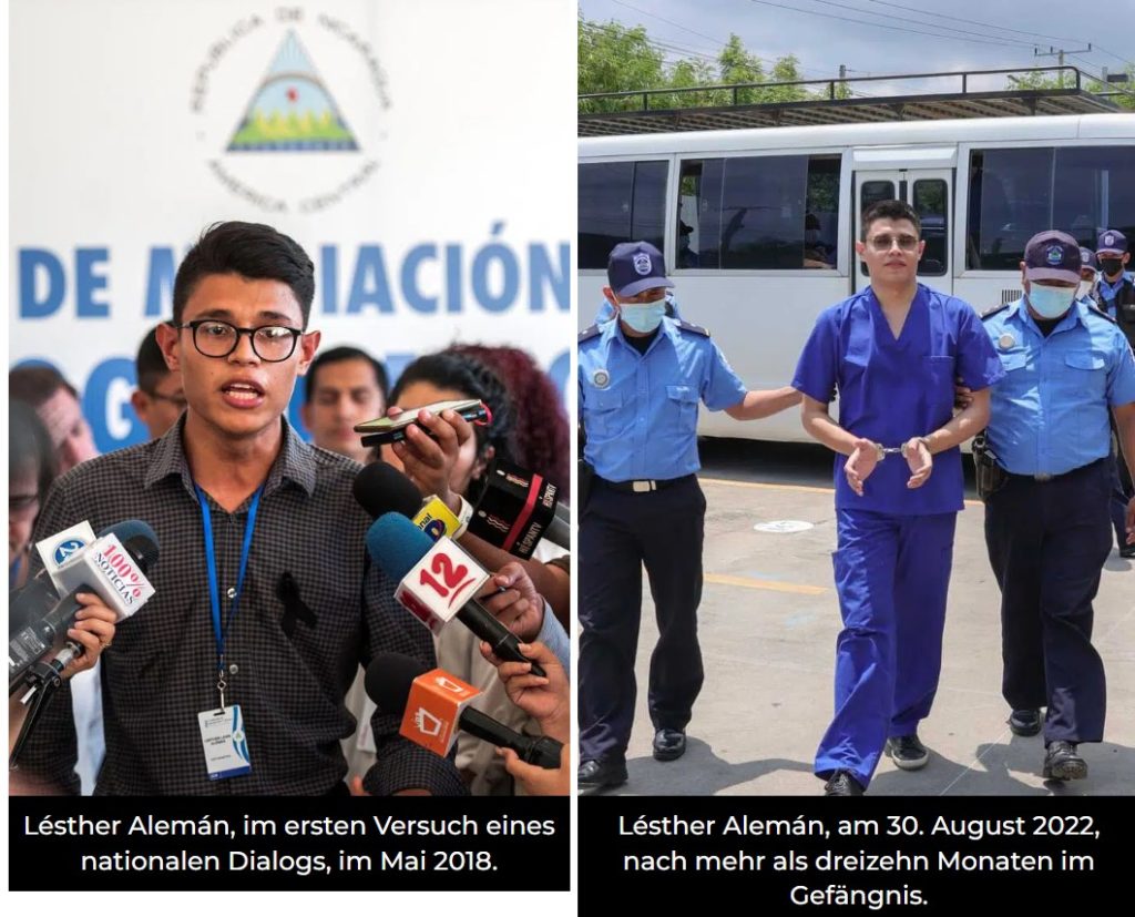 Am 30. August wurde der Studentenführer Lésther Alemán vorgeführt, der Daniel Ortega zurechtgewiesen und seinen Rücktritt gefordert hatte, zu Beginn des ersten Versuchs eines „Nationalen Dialogs“ im Mai 2018, nach den ersten Tagen des Orteguesita-Massakers gegen den sozialen Aufstand im April. Und auch der Präsident der nicaraguanischen Universitätsallianz (AUN), Max Jerez. Beide wurden am 5. Juli 2021 von der Nationalpolizei entführt.