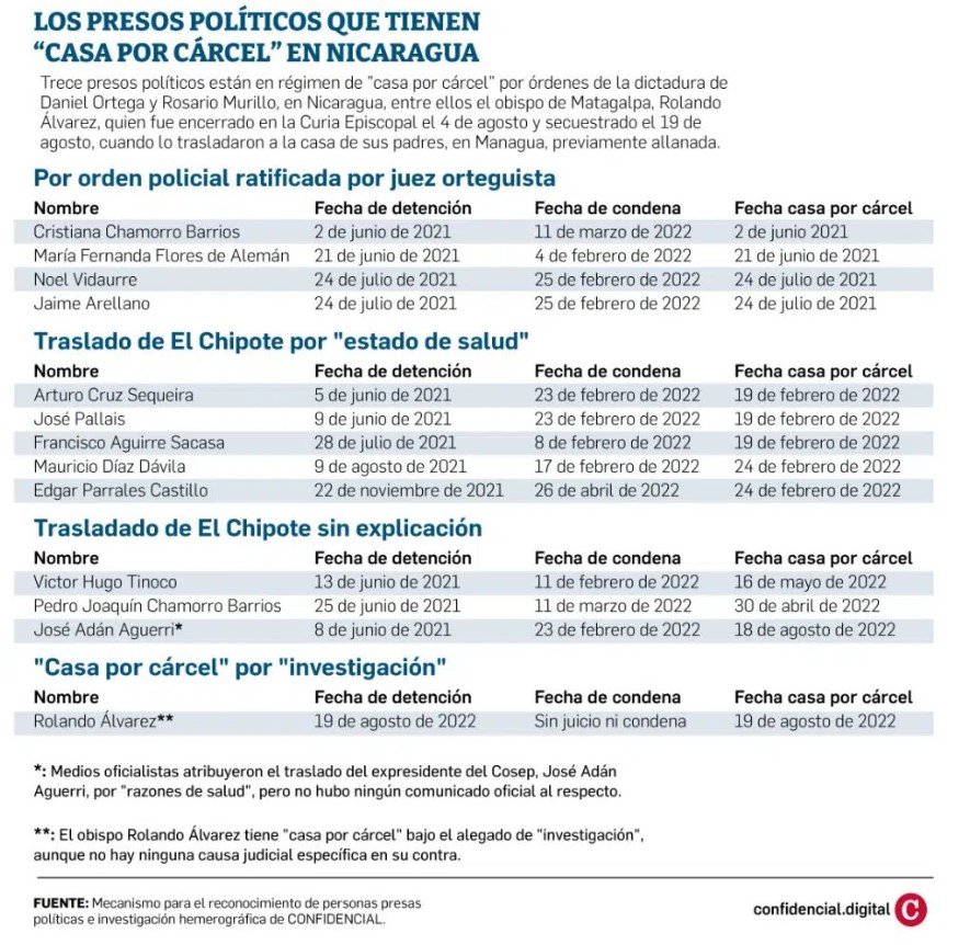Drei Präsidentschaftskandidaten haben „Hausarrest statt Gefängnis“, und nur einmal wurde ein Foto von einem von ihnen gezeigt. Es war die unabhängige Präsidentschaftskandidatin Cristiana Chamorro im April 2022. Diejenigen, die unter „Hausarrest“ stehen, sind: