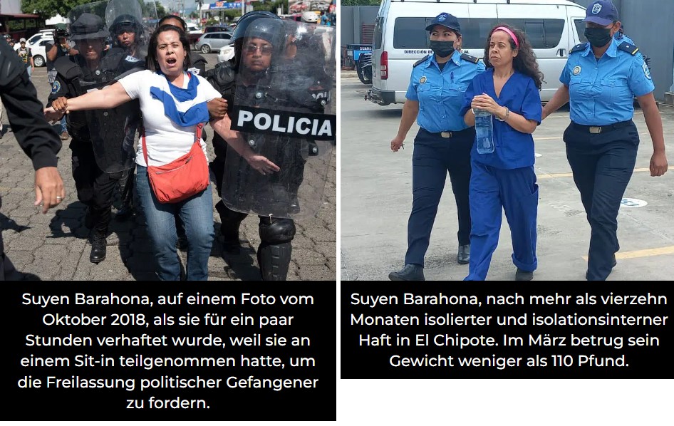 Barahona ist seit ihrer Gefangennahme am 13. Juni 2021 isoliert und in Einzelhaft. Mit den unmenschlichen Bedingungen ihrer Gefangenschaft und prekären Essensrationen hat sie mehr als 30 Pfund an Gewicht verloren und hat Hauteffekte und Schmerzen im Körper.