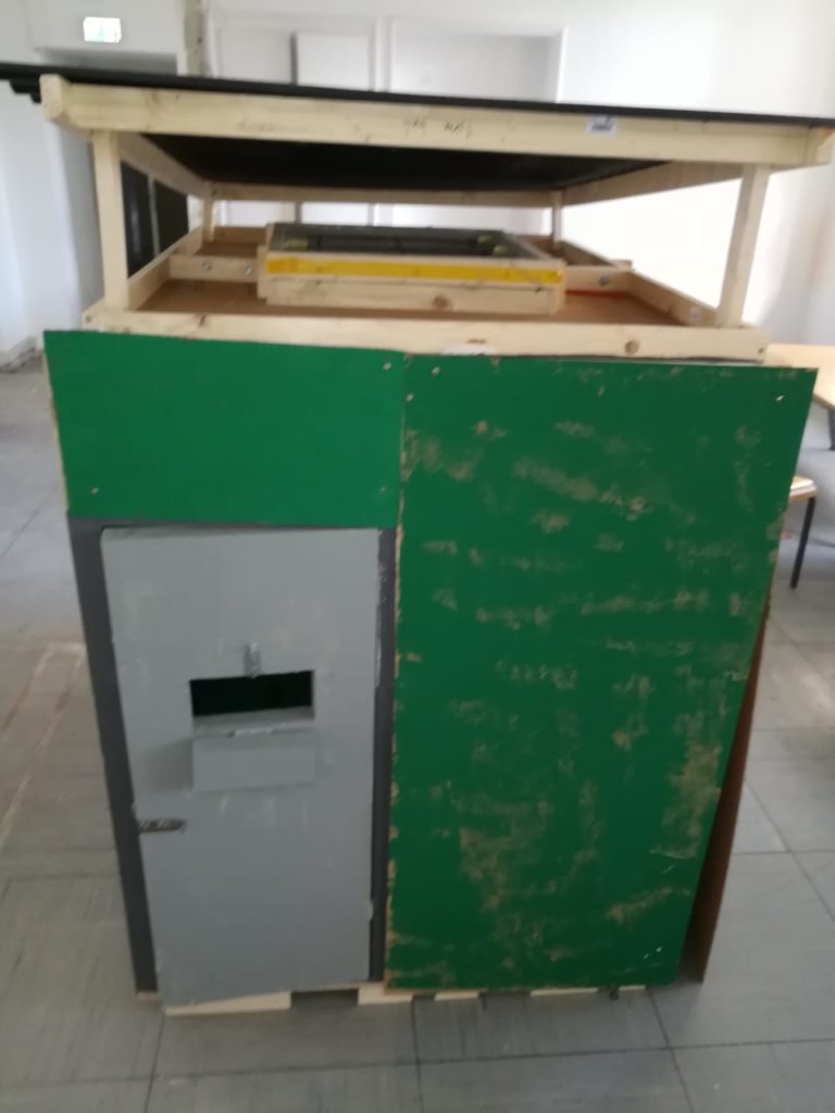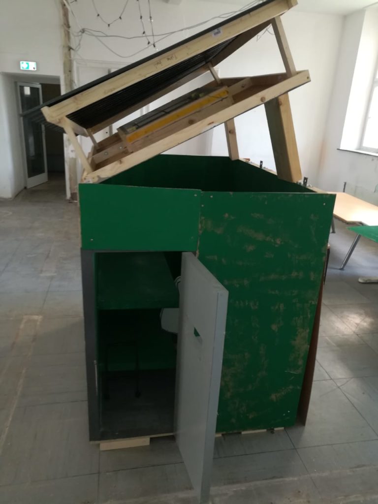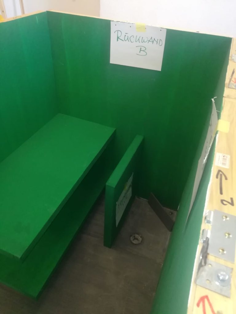 Das Modell ist durch das 1:2 Format leichter transportabel und problemlos bei Indoor Veran-staltungen einsetzbar. Die Grundfläche beträgt 1,40 x 1,10 m, die Höhe über alles (leichtes Schrägdach) 1,50m. Zerlegt ist die Zelle( 140 x 130 x 60) in einem Kombi/ Kleintransporter leicht zu transportieren. Der Aufbau dauert bei etwas Geschick mit 2 Personen ca 60 Minuten.