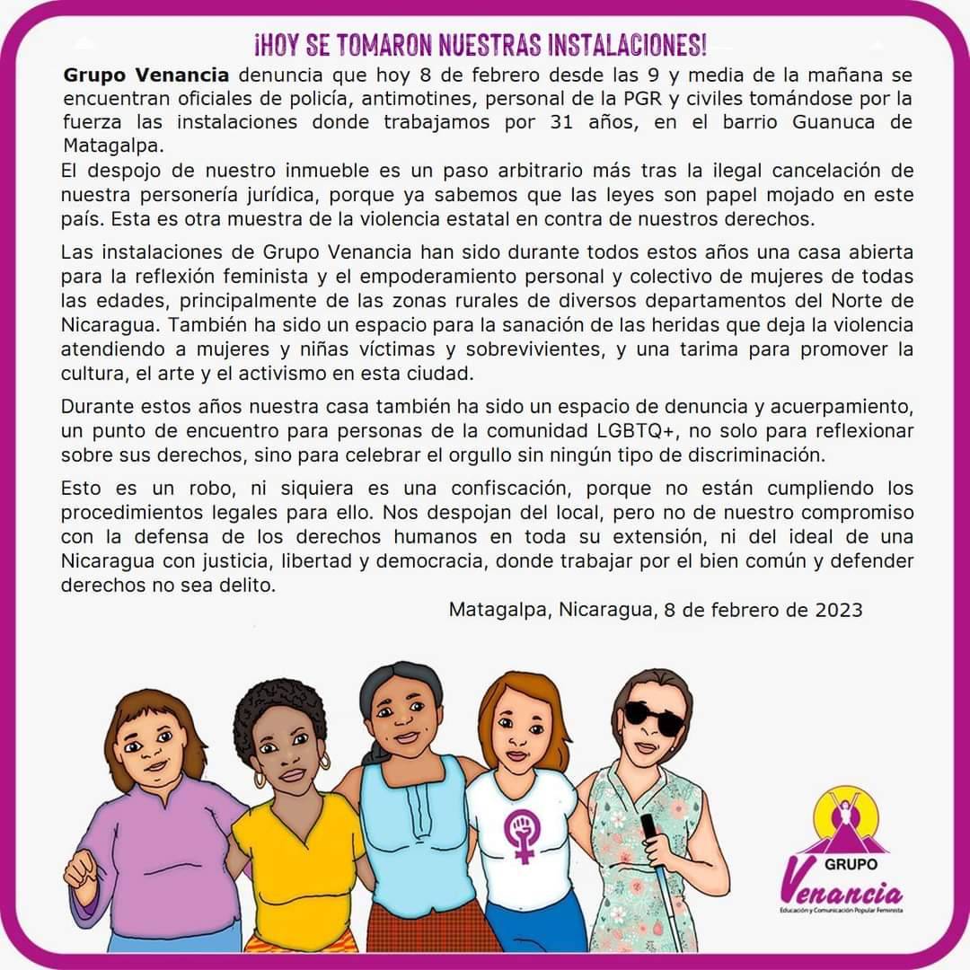 | | Am 8. Februar 2023 kam die Polizei und Antistreikkräfte in das Haus von Grupo Venancia im Stadtteil Guanuca/Matagalpa, in dem sie 31 Jahre gearbeitet haben und beschlagnahmten alles. Die Gruppe Venancia benennt das als illegalen Raub. Ein Staat, in dem man nicht mehr für das Gemeinwohl arbeiten könne und einen Ort von freiem Austausch und kulturellem Leben anbieten könne, sei kein Rechtsstaat mehr. |