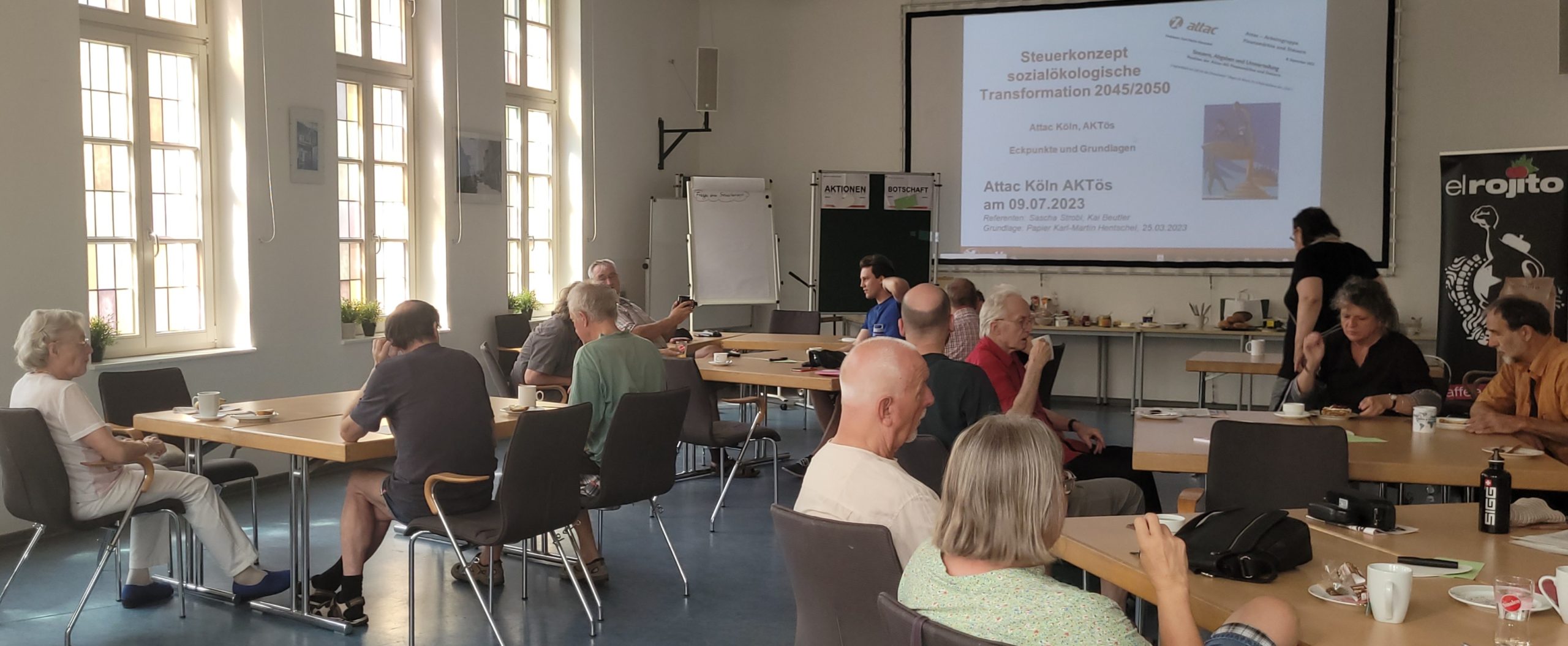 Sascha Strobl und Kai Beutler stellten anschliessend das Steuerkonzept sozialökologische Transformation auf der Basis der Attac-AG „Finanzmärkte und Steuern“ vor, welches Antwort auf die Fragen geben soll: Wie ist ein gutes Leben für alle Menschen möglich, bei dem das Klima, die Ressourcen und die Artenvielfalt erhalten bleiben? Wie kann eine sozialökologische Steuerreform dazu beitragen, die Schere zwischen Arm und Reich zu schließen, in Deutschland und weltweit? Da sich besonders seit den 80er Jahren die Einkommen in Deutschland auseinander entwickeln, ergeben sich bereit hieraus existenzielle politische, ökologische und soziale Probleme. Die Grundgedanken beim attac-Steuerkonzept sind: