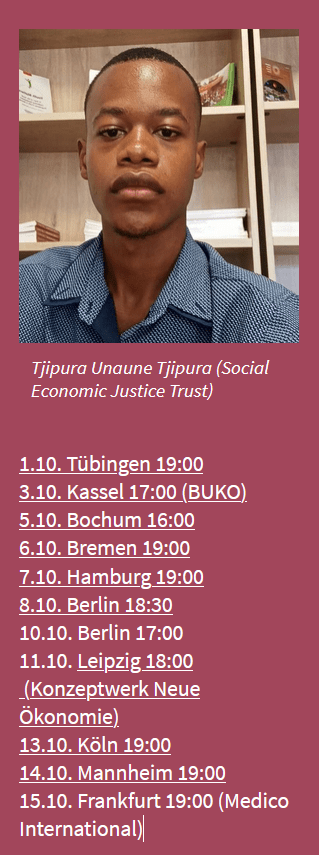 Die beiden namibischen Aktivisten Paul Thomas und Tjipura Unaune Tjipura werden mit uns ihre Kritik an dem Projekt diskutieren.