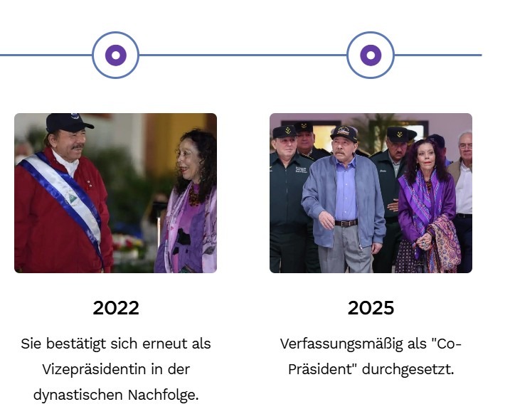 - Unterdrückung und Gewalt: Ein Chef der nicaraguanischen Armee, der der „Co-Präsidentschaft“ die Treue geschworen hat und einen „institutionellen Puffer“ leitet, sowie die „Co-Direktoren“ der Nationalpolizei mit mehr als 76.000 „freiwilligen Polizisten“.