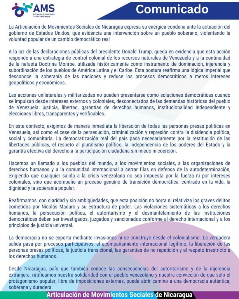 Die AMS drückt ihre energische Verurteilung der Handlungen der amerikanischen Regierung aus, deren Aktion gegen ein souveränes Volk gerichtet war.