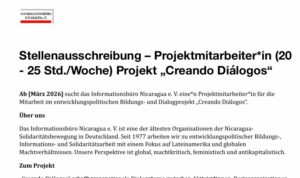Stellenausschreibung – Projektmitarbeiterin (20 – 25 Std./Woche) Projekt „Creando Diálogos“ Ab [März 2026] sucht das Informationsbüro Nicaragua e. V. eine*n Projektmitarbeiter*in für die Mitarbeit im…