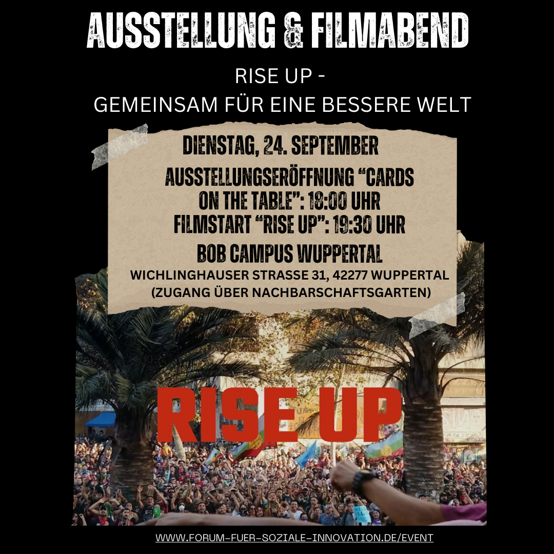 Rise UP: Der Film sucht gemeinsam mit fünf außergewöhnlichen Menschen Antworten auf die verheerenden ökologischen, wirtschaftlichen und autoritären Entwicklungen unserer Zeit. Können die gewaltigen globalen Krisen der Gegenwart überhaupt noch bewältigt werden? Es heißt, dass jeder gesellschaftliche Fortschritt von mutigen Menschen erkämpft werden musste – doch wie ist ihnen das gelungen? Fünf Geschichten über konkrete gesellschaftliche Umbrüche geben Antworten.“ RISE UP ist ein brennendes Plädoyer für die Möglichkeit einer besseren Welt! Trailer siehe: https://www.riseup-film.de/