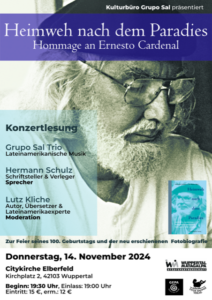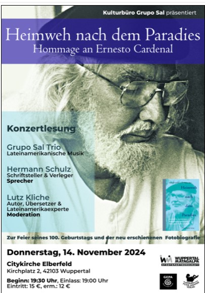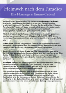 Als Hommage an Ernesto Cardenal und mit Blick auf seinen anstehenden 100. Geburtstag im nächsten Jahr sowie anlässlich der Herausgabe des beeindruckenden Gedenkbandes „Heimweh nach dem Paradies – Ernesto Cardenal: Dichter, Priester, Revolutionär“ laden wir dazu ein, sein eindrucksvolles Leben, sein Werk und seinen prägenden literarischen und politisch-theologischen Fußabdruck gemeinsam mit uns zu feiern.