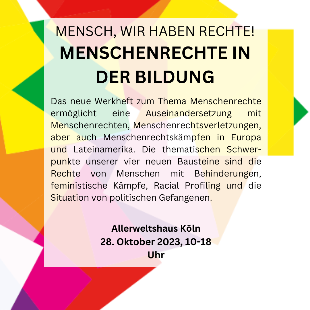 Das neue Werkheft zum Thema Menschenrechte ermöglicht eine Auseinandersetzung mit Menschenrechten, Menschenrechtsverletzungen, aber auch Menschenrechtskämpfen in Europa und Lateinamerika. Die thematischen Schwerpunkte unserer vier neuen Bausteine sind die Rechte von Menschen mit Behinderungen, feministische Kämpfe, Racial Profiling und die Situation von politischen Gefangenen.