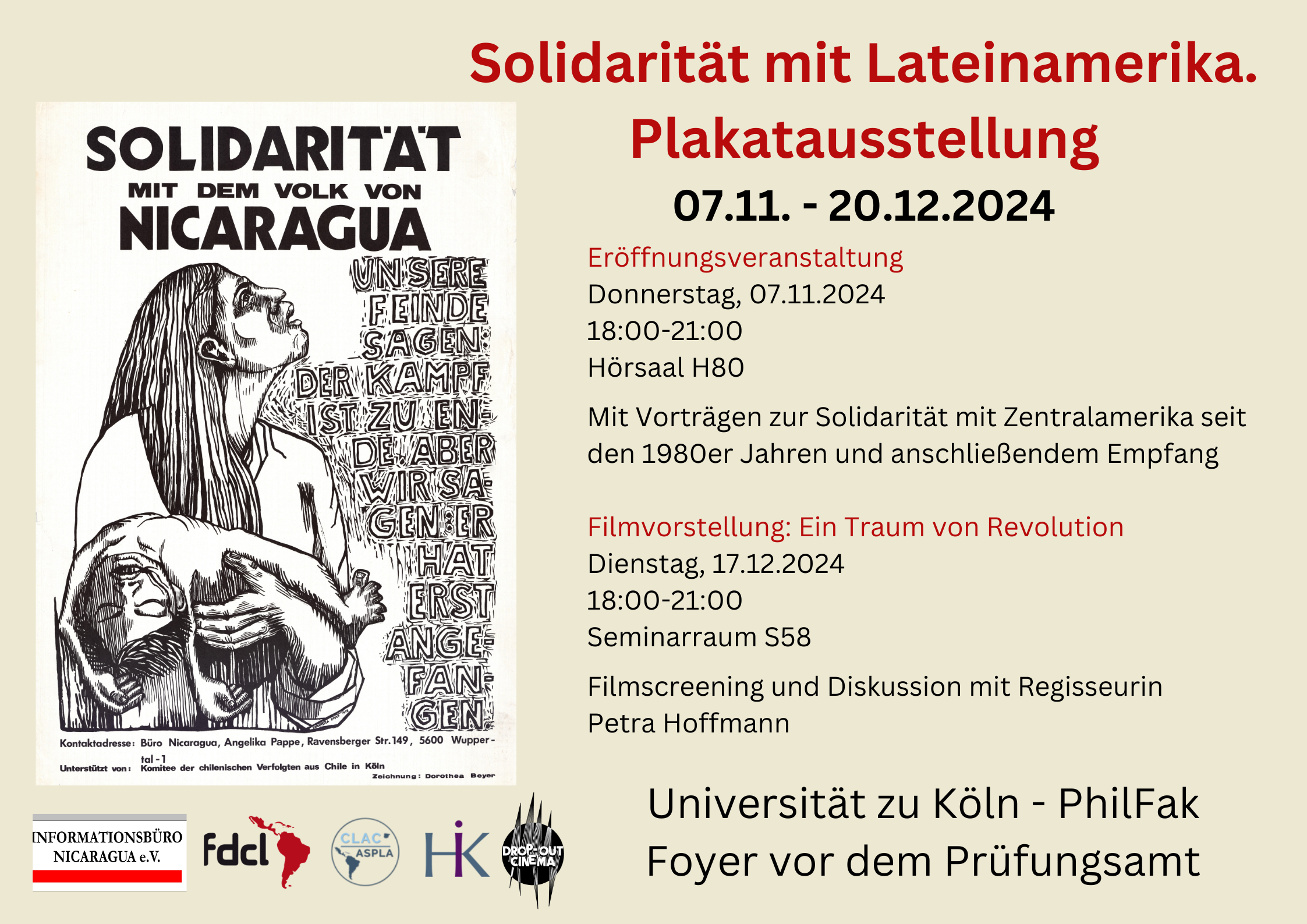 Seit dem 07.11.2024 zeigen das Centro Latinoamericano de Colonia (CLAC) und die Abteilung für Iberische und Lateinamerikanische Geschichte (IHILA) der Universität zu Köln im Philosophikum die Plakatausstellung „Solidarität mit Zentralamerika“. Kernstück der Ausstellung sind eindrucksvolle Kunstdrucke, die über ihre aufrüttelnde Bildsprache in den 1970er und 1980er Jahren zur Solidarität mit den sozialen Bewegungen Zentralamerikas aufriefen.